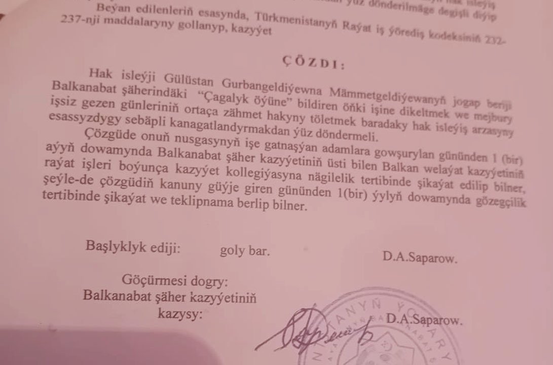 The next day, October 14, the head of the personnel department and ex officio chair of the trade union committee, Mahri Orazova, called a meeting at which she announced that Gulistan Mammetgeldiyeva had been dismissed from work at the demand of “a body or official with powers to do this” (Art. 38, part 9 of the Labor Code). On October 17, at the suggestion of the prosecutor’s office, children’s home director Nazarmammet Arazov signed an order dismissing Gulistan “for the commission of an immoral offense by an employee performing caregiving functions, which is incompatible with the continuation of this work” (Art. 43, part 4 of the Labor Code). They should have given Gulistan her labor record book and a copy of the order terminating her labor contract, but didn’t do so.