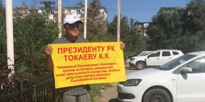 В Актобе фермер приковал себя цепью к ограждению у здания партии власти