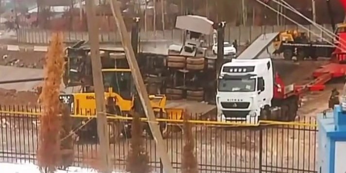 Сообщается, что автокран рухнул во время монтажа железобетонных балок двумя кранами, массой 30,6 тонн.