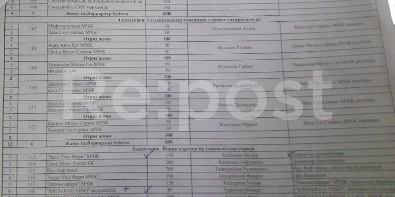 В распоряжении Repost список лиц, принужденных к сбору хлопка по приказу районного хокима Сырдарьи. В списках оказались как работники государственных учредений, так и частные предприниматели.