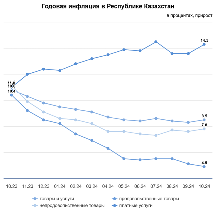В региональном разрезе в октябре 2024 года в годовом выражении уровень инфляции, превышающий среднереспубликанский, сложился в десяти регионах, из них наибольший — в Астане (10,2 процента), в Мангистауской области (9,7 процента), в Алматы и Западно-Казахстанской области (по 9,4 процента).