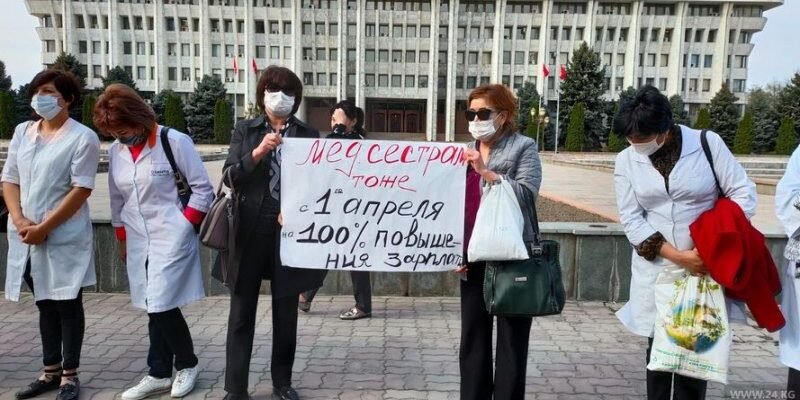Медики Бишкека и Чуйской области вышли на митинг к зданию Жогорку Кенеша. Более 100 врачей обращаются к президенту и требуют, чтобы им выплатили обещанные компенсации в размере 200 тысяч сомов за работу в красных зонах в период пандемии коронавируса.