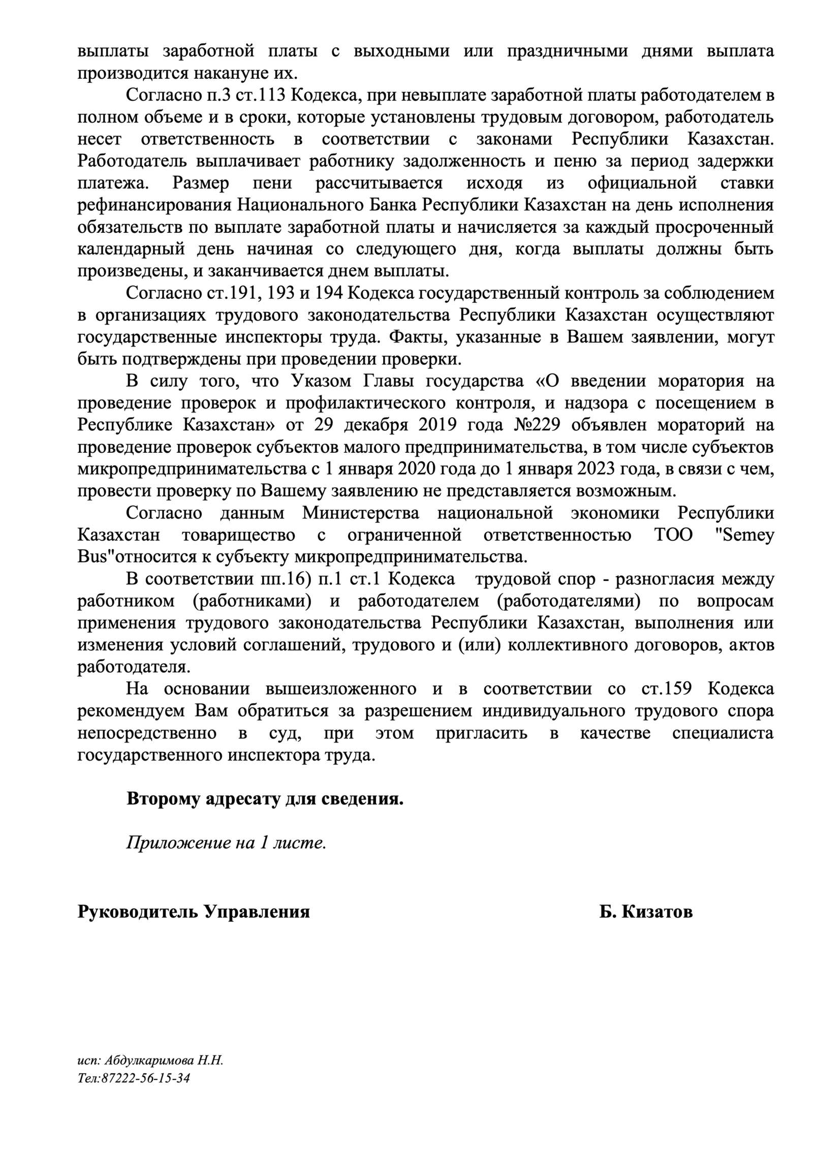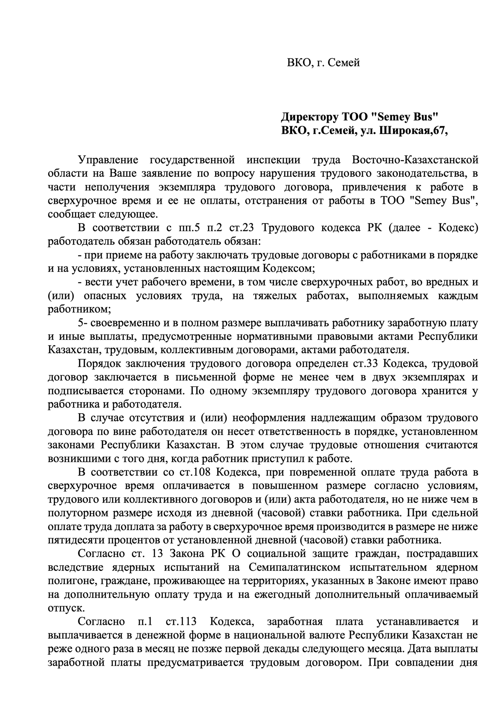 О мытарствах работников крупнейшего автоперевозчика г. Семей написано много статей и отсняты телевизионные сюжеты в республиканских и региональных СМИ. Но проблема представителей трудового коллектива ТОО «Semey Bus» не решается. Группа активистов из числа действующих и уволенных работников ТОО «Semey Bus» пытается как то защитить свои социальные права, но на тыкается на отпор мощной бюрократической машины. Представители инициативной группы работников автоперевозчика г. Семей получили десятки дежурных «отписок» от должностных лиц государственных органов Восточно-Казахстанской области, которые по роду своей должностных полномочий должны защищать права, свободы и законные интересы трудящихся. Одним из таких ответов является ответ руководителя Управления государственной инспекции труда Восточно-Казахстанской Б. Кизатова (исходящий номер и дата не указана) бывшему работнику ТОО «Semey Bus» N.