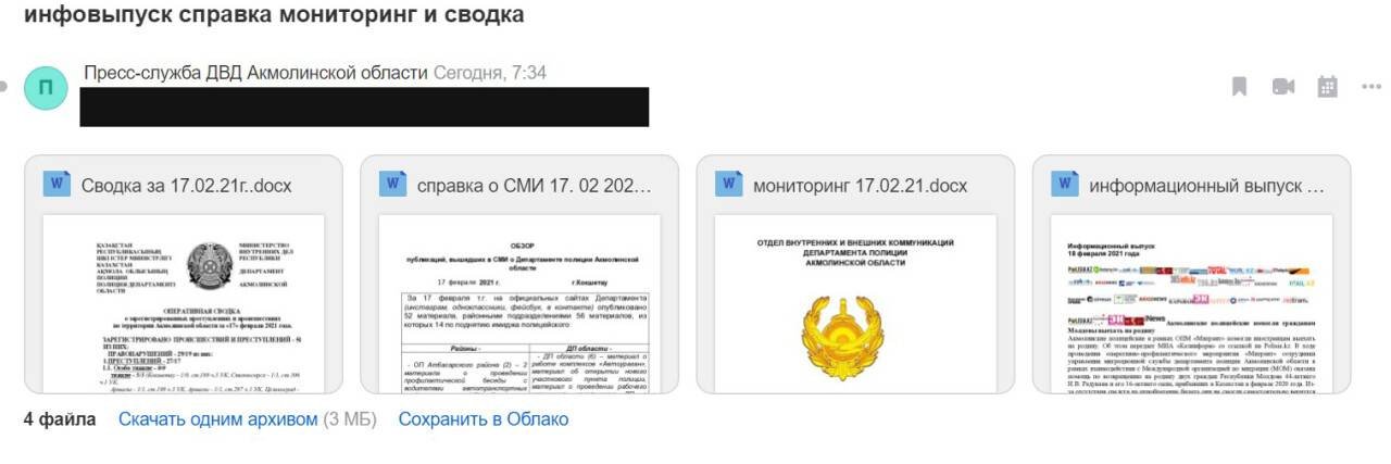 Через два часа после отправки файлов журналисты получили письмо от пресс-службы ДП Акмолинской области, где помимо пояснения об ошибке содержалась угроза о привлечении к уголовной ответственности за публикацию сведений из ранее отправленных полицией документов.