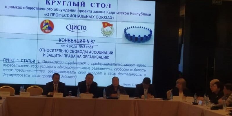 Круглый стол был организован Центром исследований социально-трудовых отношений, Профсоюзом работников пищевой и перерабатывающей промышленности и Горно-металлургическим профсоюзом Кыргызстана.
