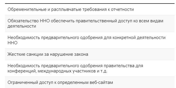 Кроме того, согласно пункту 13, регулятор имеет право не согласовать грант, если есть посягательство на нравственность граждан. Однако данное понятие не закреплено законодательством и, учитывая расплывчатый характер, данный пункт может быть использован органами юстиции для отказа в зарубежном финансировании ННО. В постановлении также перечислены другие всевозможные причины, по которым регистрирующий орган может отказать в согласовании – в том числе, если документы содержат недостоверную информацию, если получение денежных средств или имущества противоречит законодательству и уставу ННО, если заявление на согласование подавалось без соблюдения установленного порядка и сроков, если не предоставляются дополнительные документы, запрашиваемые регистрирующим органом.